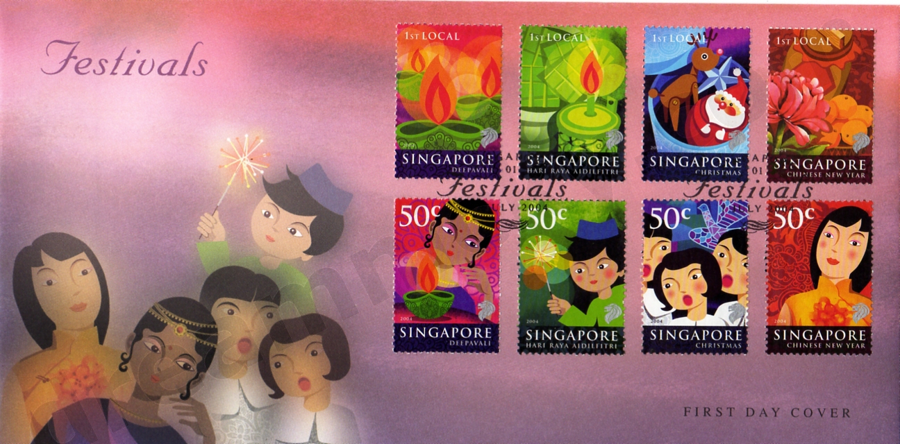 Singapore is as much a place of diverse cultures as it is a place where people of different cultures and religions can live, work and play. This rich and multicultural diversity is best reflected in the many colourful and vibrant festivals celebrated during the year. The four main festivals celebrated in Singapore are beautifully featured with various festive elements and traditional motifs within the frame of this set of 8 stamps.