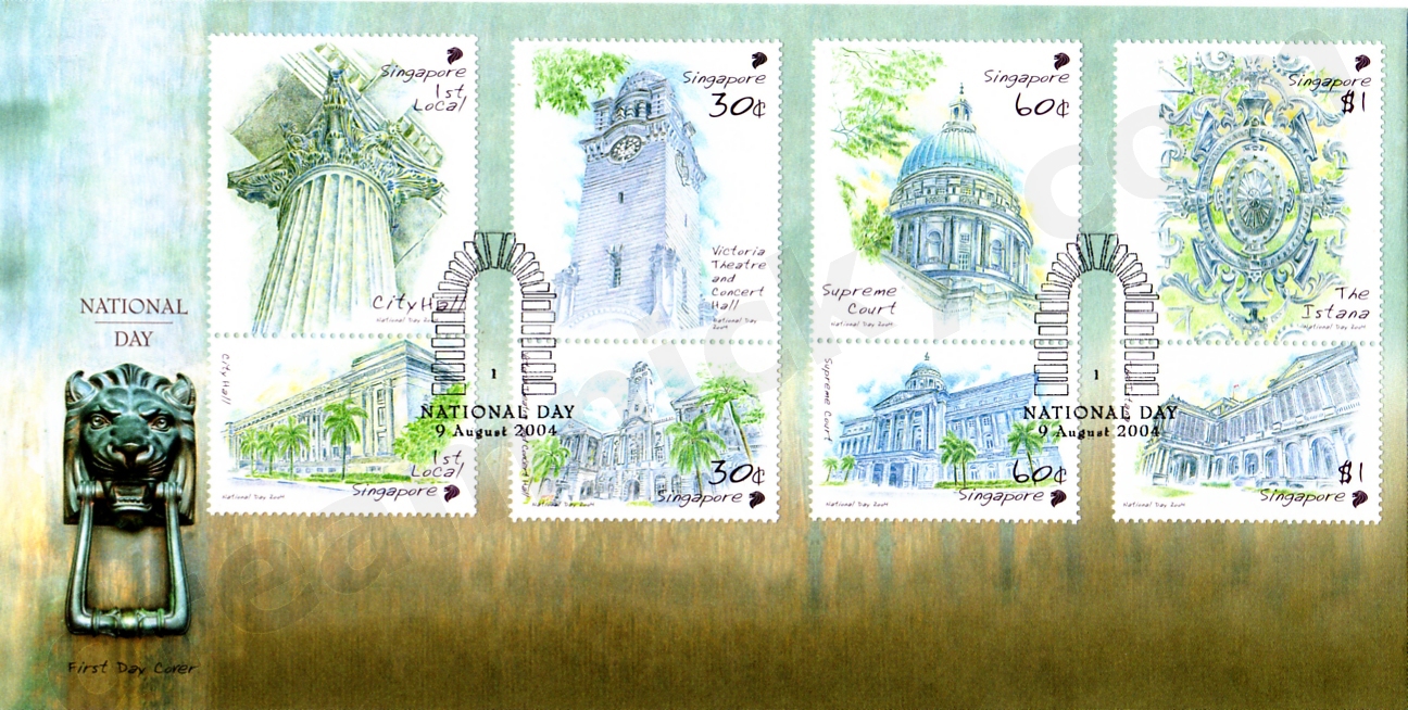 Four of these National Monuments – City Hall, Victoria Theatre and Concert Hall, Supreme Court and The Istana - are featured in this stamp issue on our nation's built heritage. This issue is released to celebrate Singapore's National Day on 9 August 2004.