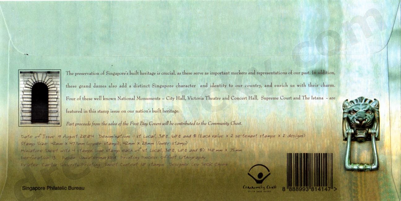 The preservation of Singapore's built heritage is crucial, as these serve as important markers and representations of our past. In addition, these grand dames also add a distinct Singapore character and identity to our country, and enrich us with their charm. Four of these well known National Monuments – City Hall, Victoria Theatre and Concert Hall, Supreme Court and The Istana - are featured in this stamp issue on our nation's built heritage.