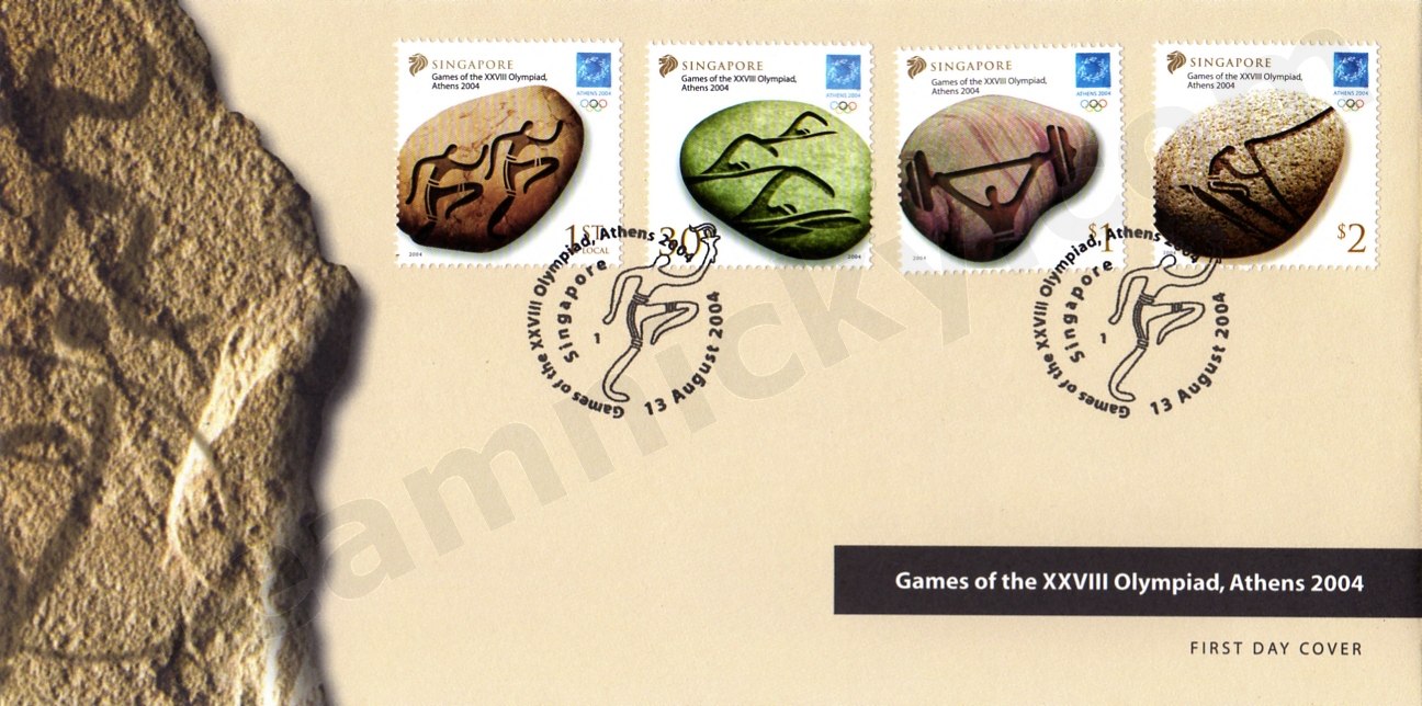 The Ancient Olympics seem to have been held as early as 776 BC in Greece. The first modern Olympic Games was held in Athens in 1896 and in 2004, the Games will return to their origins as Athens hosts the Games of the XXVIII Olympiad. With reference to the Ancient Olympics, some of Singapore's popular Olympic sports are graphically illustrated on pebbles in this commemorative set of stamps.