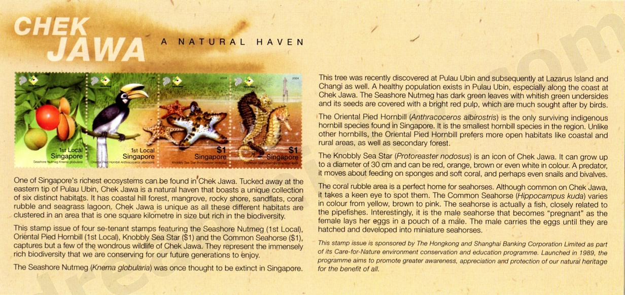 This stamp issue of four se-tenant stamps featuring the Seashore Nutmeg (1st Local), Oriental Pied Hornbill (1st Local), Knobbly Sea Star ($1) and the Common Seahorse ($1), captures but a few of the wondrous wildlife of Chek Jawa. They represent the immensely rich biodiversity that we are conserving for our future generations to enjoy.