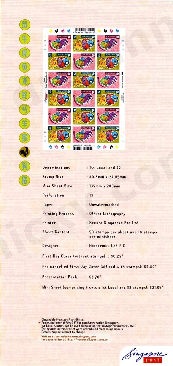 The Rooster, the tenth zodiac animal in the cycle, is featured in this series of stamps. The optimism of the Year of the Monkey will overlap the Year of the Rooster. It is believed that in the Year of the Rooster, one would have to expend maximum effort for minimum gain. Nonetheless, it is believed to be a buoyant year.