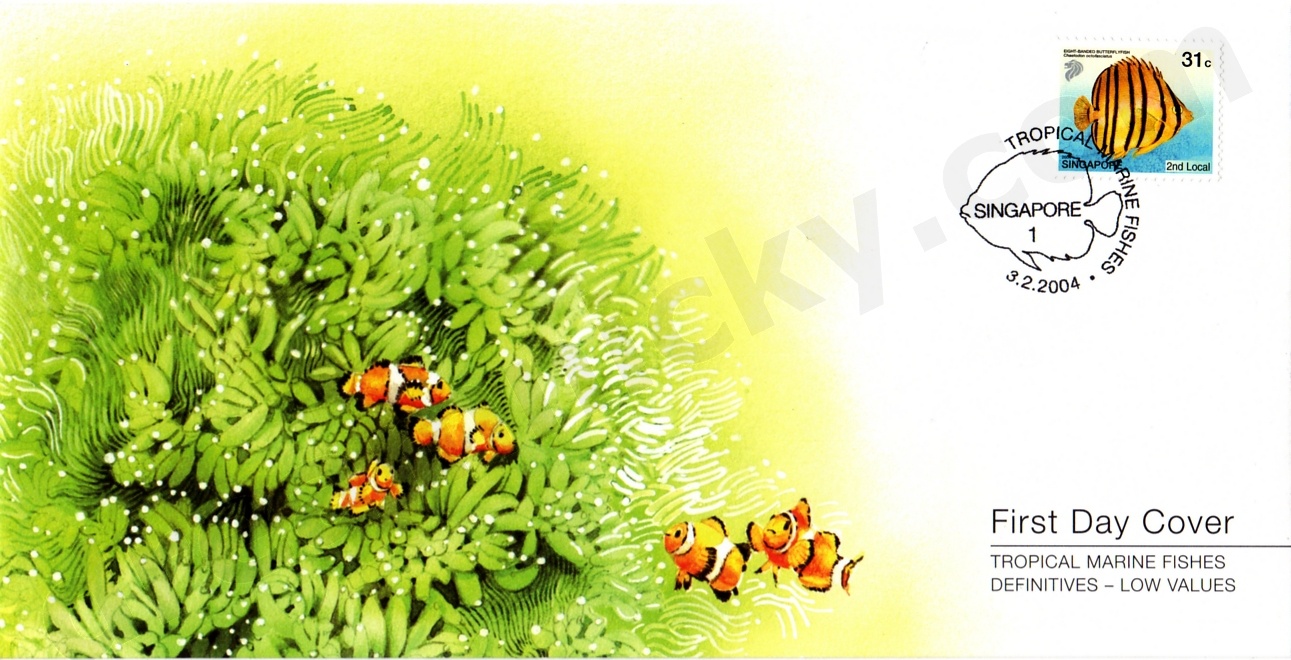The Eight-banded Butterflyfish, Chaetodon octofasciatus, is beautifully illustrated on this additional stamp to the Tropical Marine Fishes Low Value Definitives. The new stamp carries the indicator, 2nd Local, which denotes the prevailing value for the 2nd weight-step of 40gm.