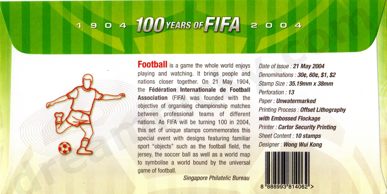 Football is a game the whole world enjoys playing and watching. It brings people and nations closer together. On 21 May 1904, the Fédération Internationale de Football Association (FIFA) was founded with the objective of organising championship matches between professional teams of different nations. As FIFA will be turning 100 in 2004, this set of unique stamps commemorates this special event with designs featuring familiar sport "objects" such as the football field, the jersey, the soccer ball as well as a world map to symbolise a world bound by the universal game of football.