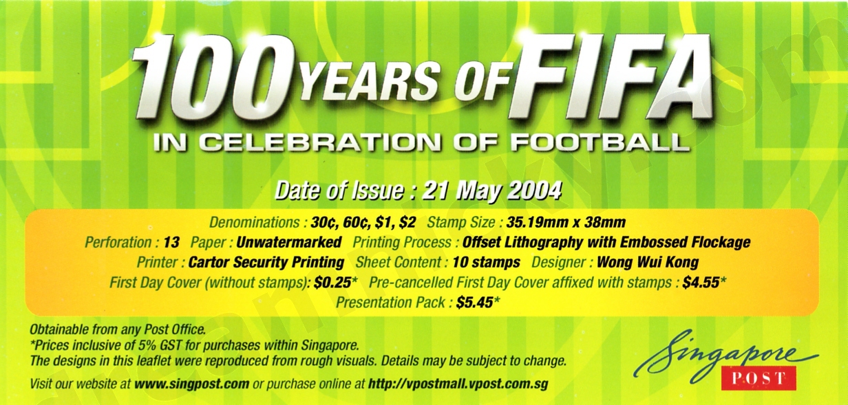 This year the Fédération Internationale de Football Association (FIFA) will be commemorating 100 years of this "beautiful game". In this special centennial issue, some familiar sport "objects" such as the football field, the jersey, the soccer ball as well as a world map to symbolise a world bound by the universal game of football are featured in this set of stamps.