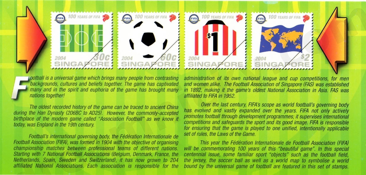 This year the Fédération Internationale de Football Association (FIFA) will be commemorating 100 years of this "beautiful game". In this special centennial issue, some familiar sport "objects" such as the football field, the jersey, the soccer ball as well as a world map to symbolise a world bound by the universal game of football are featured in this set of stamps.