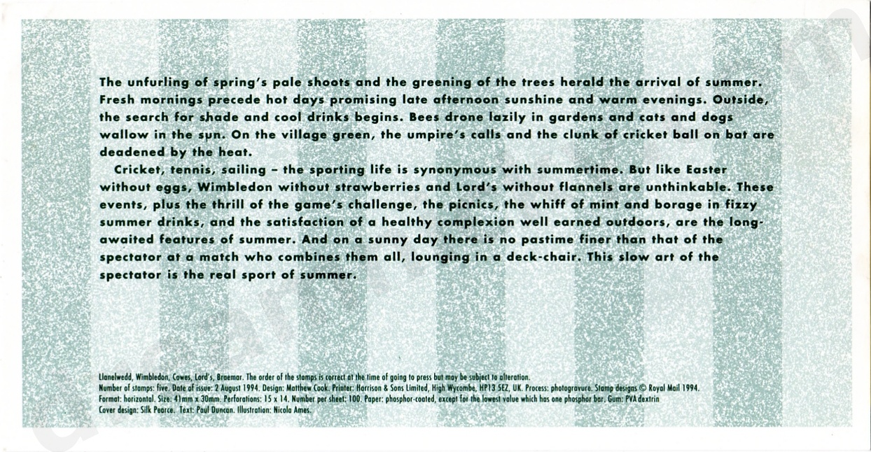 Llanelwedd, Wimbledon, Cowes, Lord's, Breamar. The order of the stamps is correct at the time of going to press but may be subject to alteration.