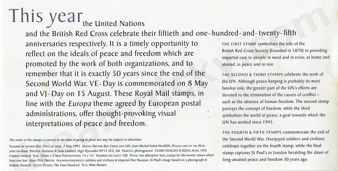 This year the United Nations and the British Red Cross celebrate their fiftieth and one-hundred-and-twenty-fifth anniversaries respectively. It is a timely opportunity to reflect on the ideals of peace and freedom which are promoted by the work of both organizations, and to remember that it is exactly 50 years since the end of the Second World War. VE-Day is commemorated on 8 May and VJ-Day on 15 August. These Royal Mail stamps, in line with the Europa theme agreed by European postal administrations, offer thought-provoking visual interpretations of peace and freedom.