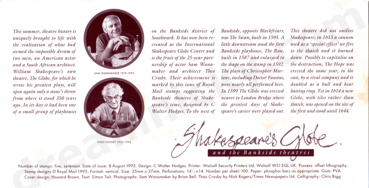 This summer, theatre history is uniquely brought to life with the realization of what had seemed the impossible dream of two men, an American actor and a South African architect. William Shakespeare's own theatre, The Globe, for which he wrote his greatest plays, will open again only a stone's throw from where it stood 350 years ago. In its day it had been one of a small group of playhouses on the Bankside district of Southwark. It has now been recreated as the International Shakespeare Globe Centre and is the fruit of the 25-year partnership of actor Sam Wanamaker and architect Theo Crosby. Their achievement is marked by this issue of Royal Mail stamps suggesting the Bankside theatres of Shakespeare's time, designed by C Walter Hodges. To the west of Bankside, opposite Blackfriars, was The Swan, built in 1595. A little downstream stood the first Bankside playhouse, The Rose, built in 1587 and enlarged to the shape on the stamp in 1592. The plays of Christopher Marlowe, including Doctor Faustus, were nearly all performed here. In 1599 The Globe was erected nearer to London Bridge where the greatest days of Shakespeare's career were played out. This theatre did not outlive Shakespeare; in 1613 a cannon used as a 'special effect' set fire to the thatch and it burned down. Possibly to capitalise on the destruction, The Hope was erected the same year, to the east, by a rival company and it doubled as a bull and bear baiting ring. Yet in 1614 a new Globe, with tiles rather than thatch, was opened on the site of the first and stood until 1644.