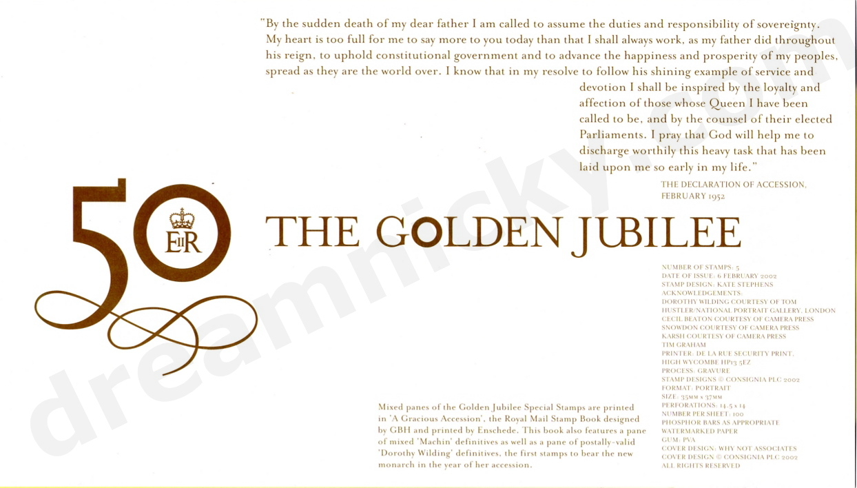 Mixed panes of the Golden Jubilee Special Stamps are printed in 'A Gracious Accession', the Royal Mail Stamp Book designed by GBH and printed by Enschede. This book also features a pane of mixed 'Machin' definitives as well as a pane of postally-valid 'Dorothy Wilding' definitives, the first stamps to bear the new monarch in the year of her accession.