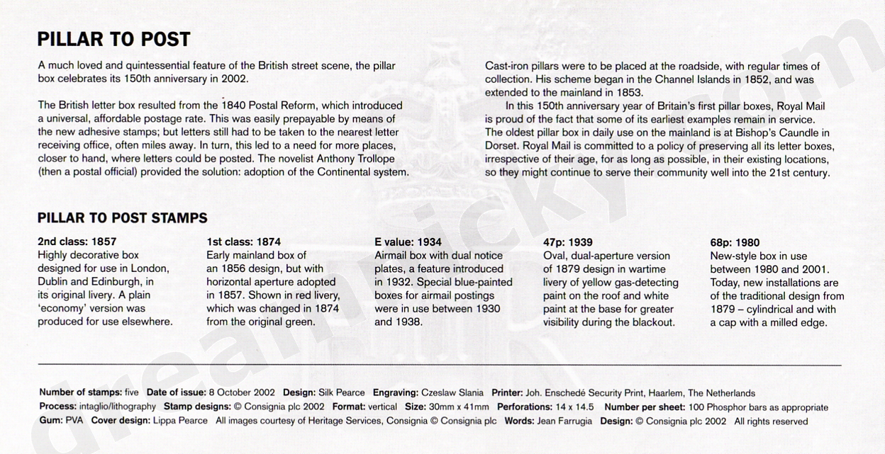 A much loved and quintessential feature of the British street scene, the pillar box celebrates its 150th anniversary in 2002.