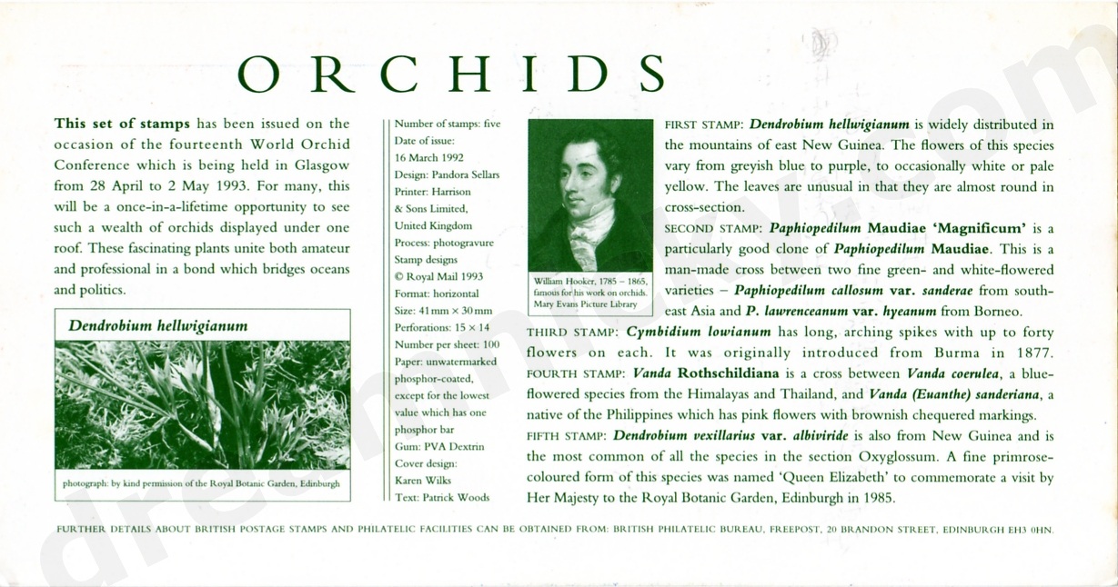This set of stamps has been issued on the occasion of the fourteenth World Orchid Conference which is being held in Glasgow from 28 April to 2 May 1993. For many, this will be a once-in-a-lifetime opportunity to see such a wealth of orchids displayed under one roof. These fascinating plants unite both amateur and professional in a bond which bridges oceans and politics.